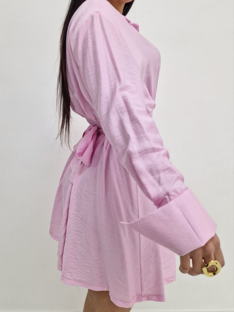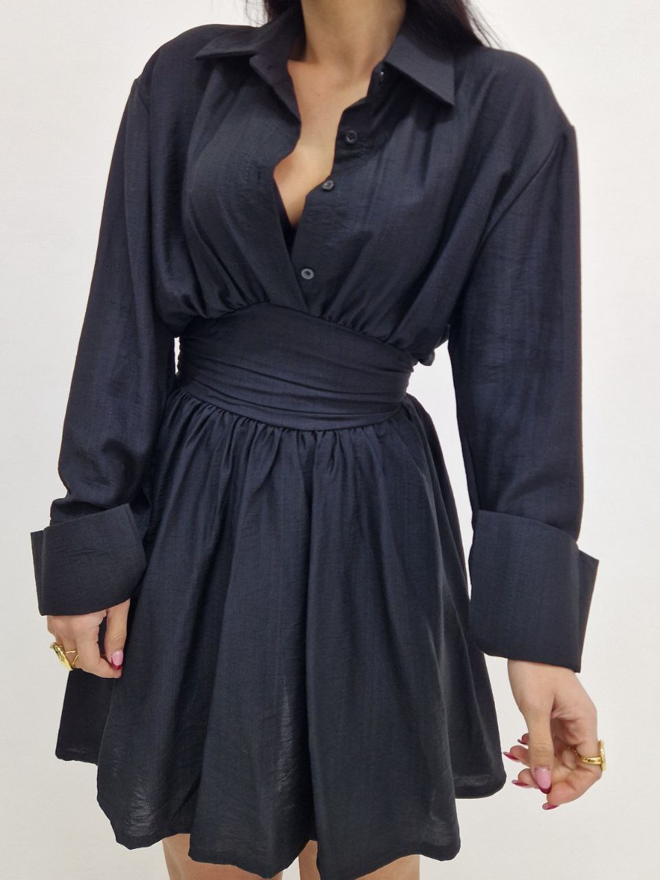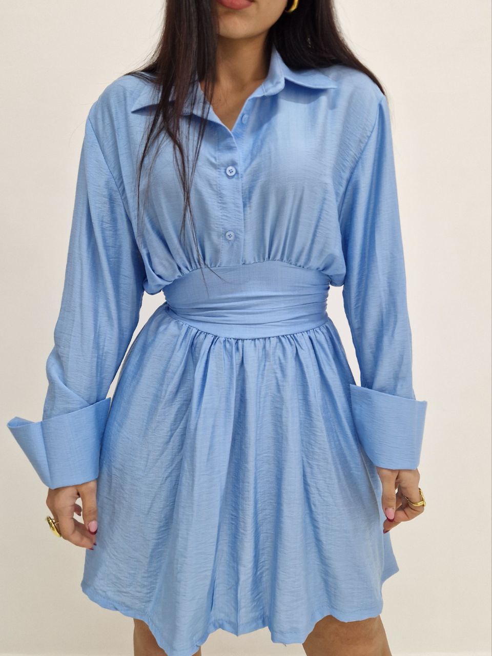 Abitino con bottoni sulla scollatura, elastico sul retro con fiocco. La taglia è unica vestibilità dalla S fino a taglia L/XL.