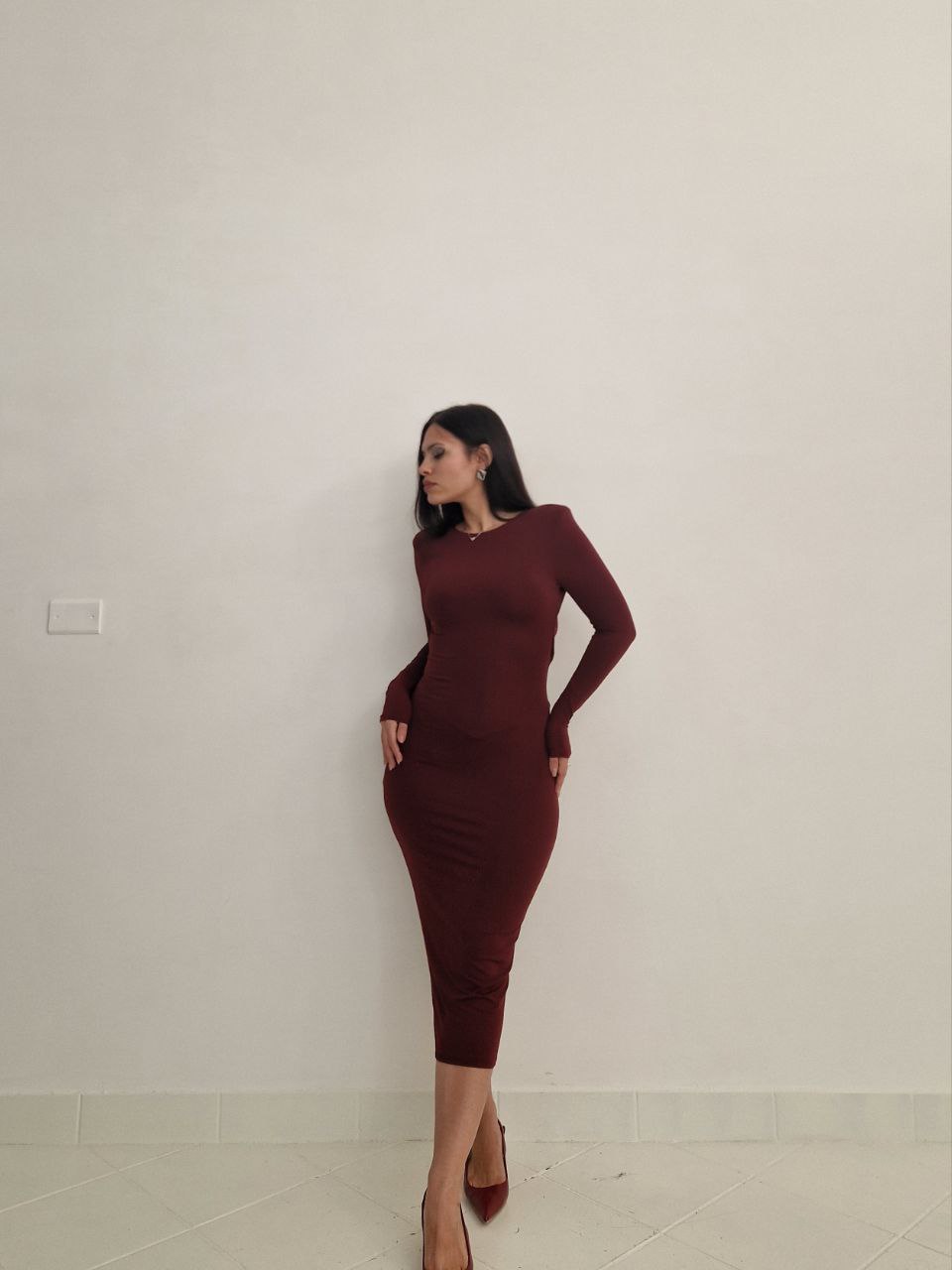 Seduzione ed eleganza si incontrano in questo abito bodycon bordeaux, perfetto per valorizzare la silhouette. Il design a maniche lunghe bilancia la sensualità dello scollo posteriore con schiena scoperta, regalando un look raffinato e femminile. La lunghezza midi slancia la figura e lo rende ideale per serate speciali, cene eleganti o eventi esclusivi.