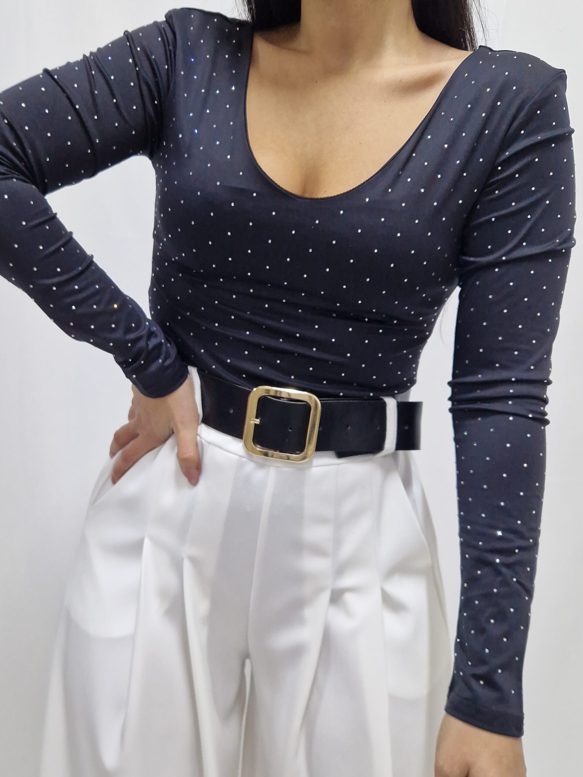 Body elasticizzato con strass solo sul davanti. La taglia è unica vestibilità dalla S fino a taglia L/XL.