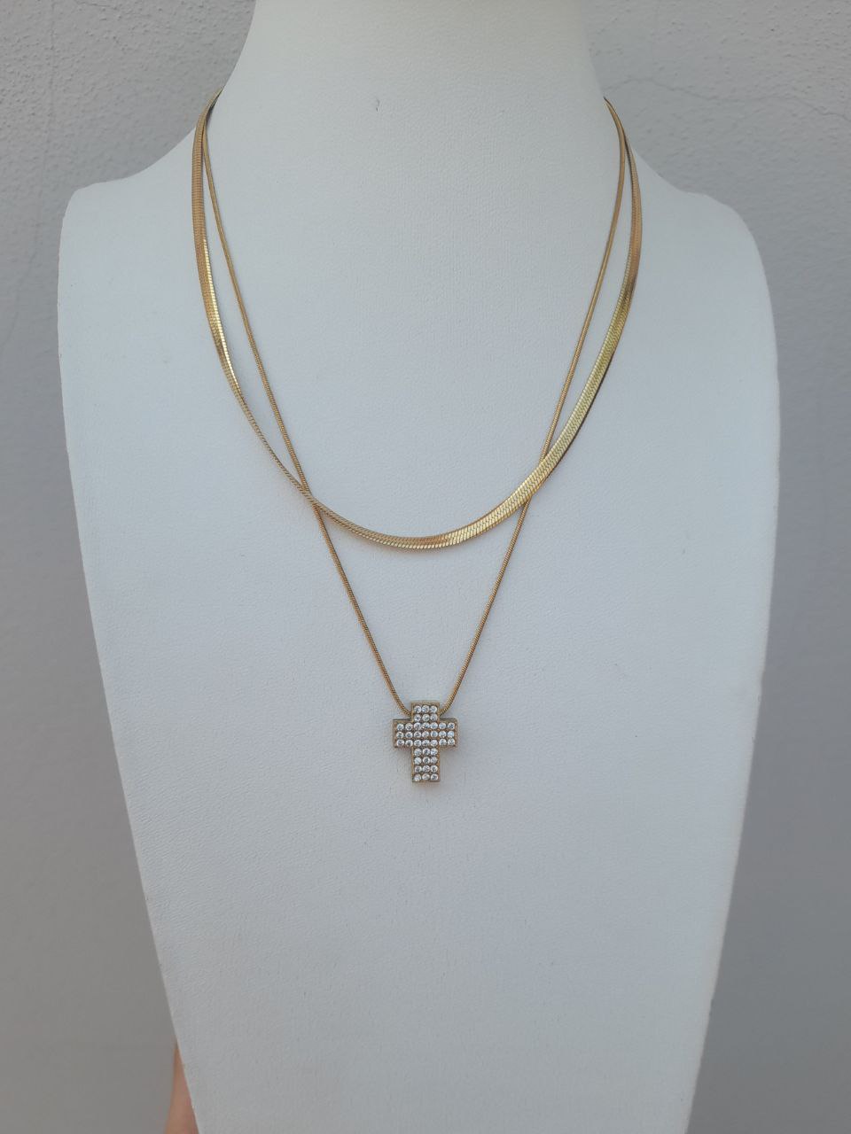 – Design: Doppia catena con pendente a croce incastonato di zirconi