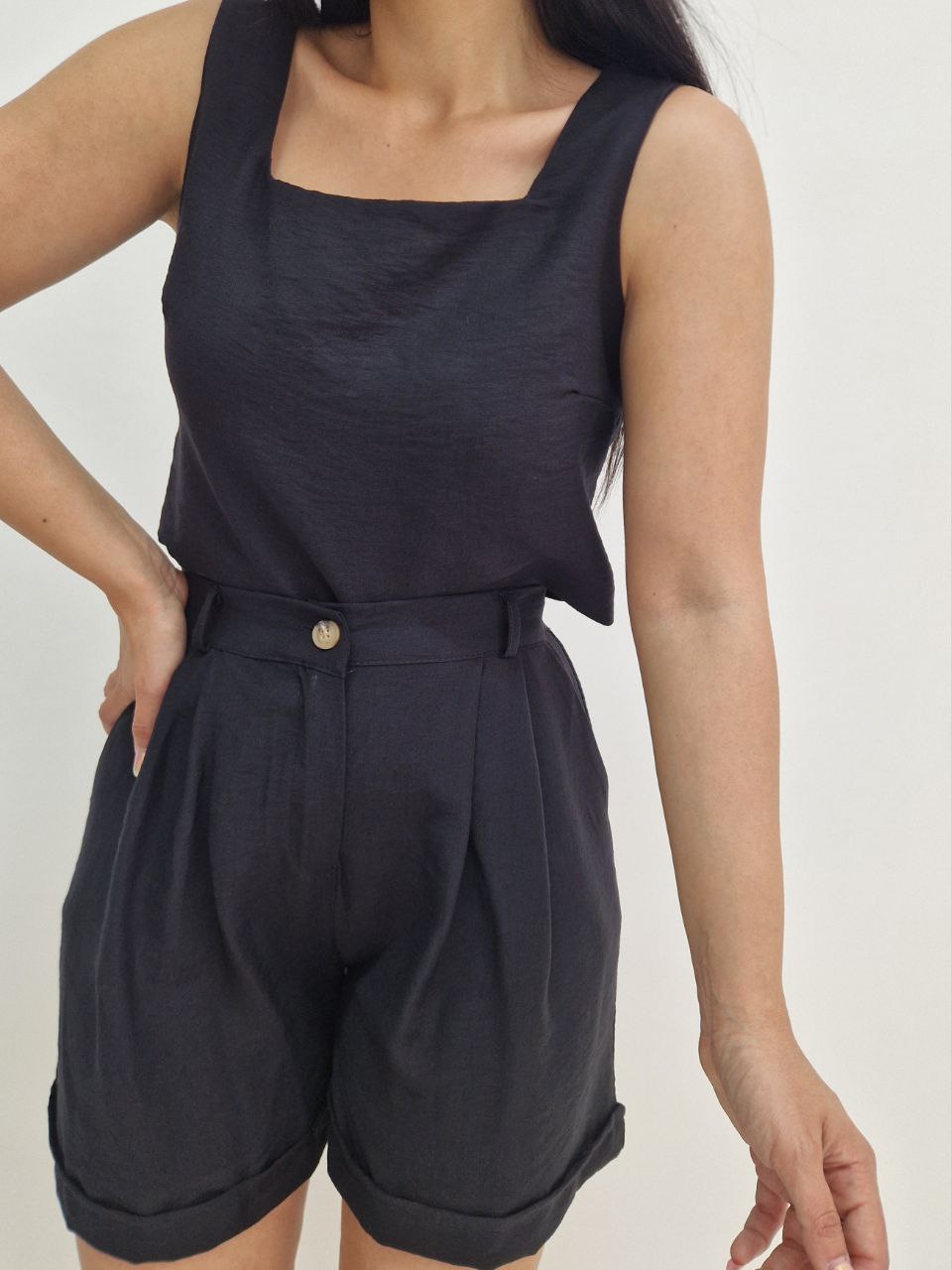Coordinato composto da top con coulisse intrecciata regolabile sul retro, e short con elastico. La taglia è unica, vestibilità fino a L/XL