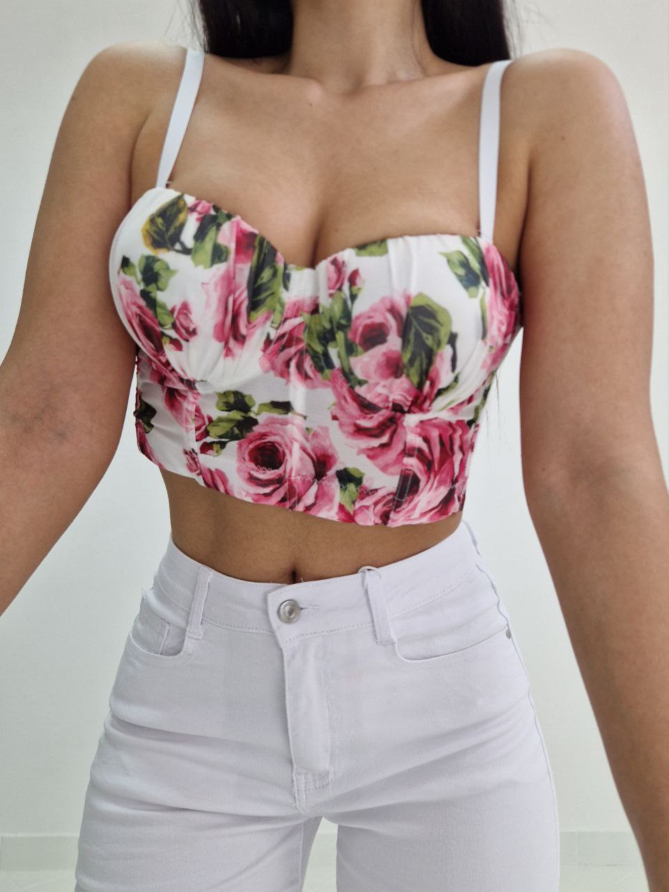 Corpetto con fantasia floreale, coppe interne, bretelle regolabile e chiusura con ganci regolabili. La taglia è unica vestibilità dalla S fino a taglia L.