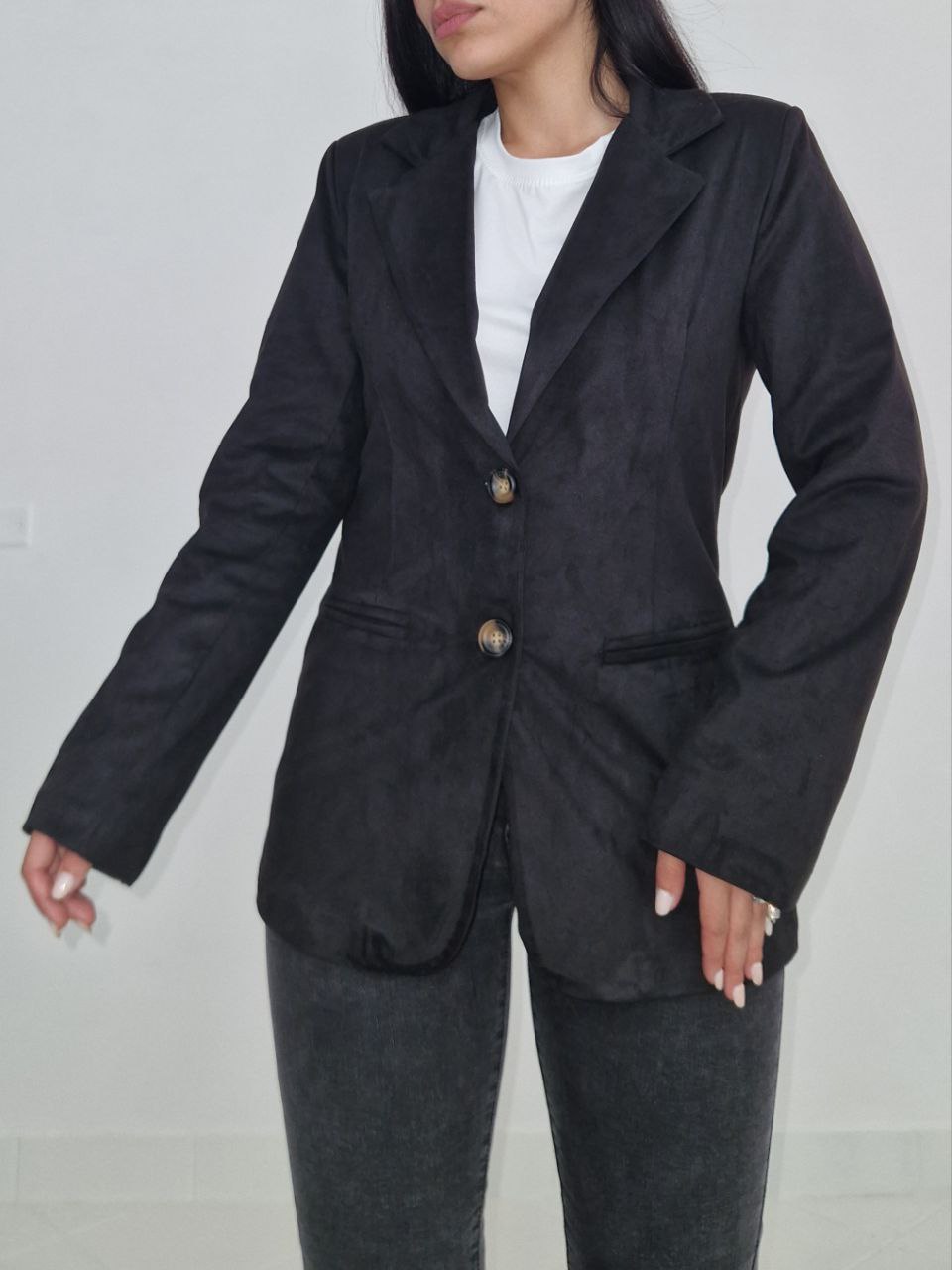La taglia unica la rende ideale per chi cerca un capo comodo ma chic, perfetto da sovrapporre a maglie leggere o camicie, senza rinunciare allo stile. Il camoscio dona una texture vellutata e raffinata, mentre il colore nero aggiunge profondità e carattere. La vestibilità e fino a taglia M/L.