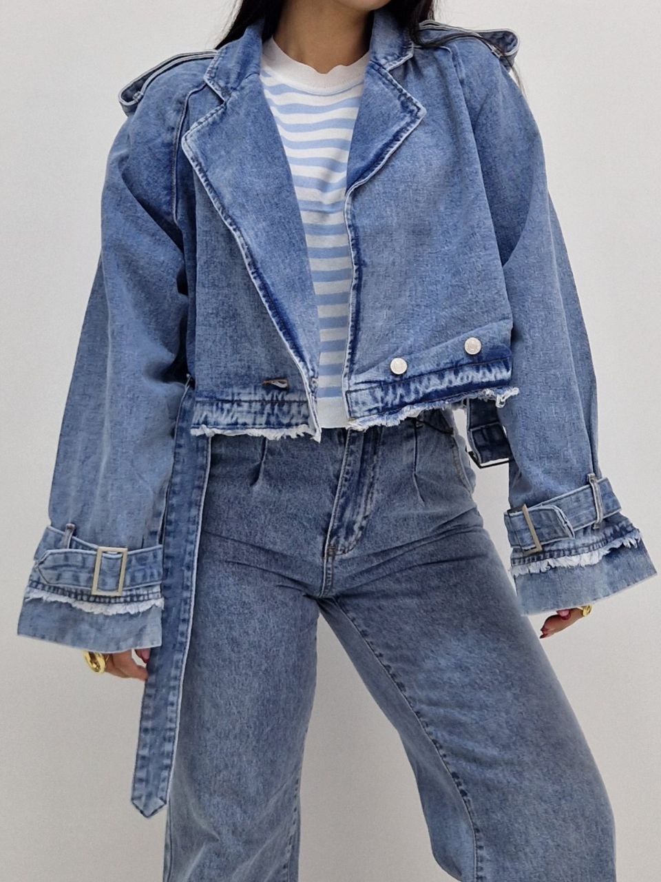 Giubbotto in jeans leggermente crop, modello oversize (non elastico) con cintura in vita.