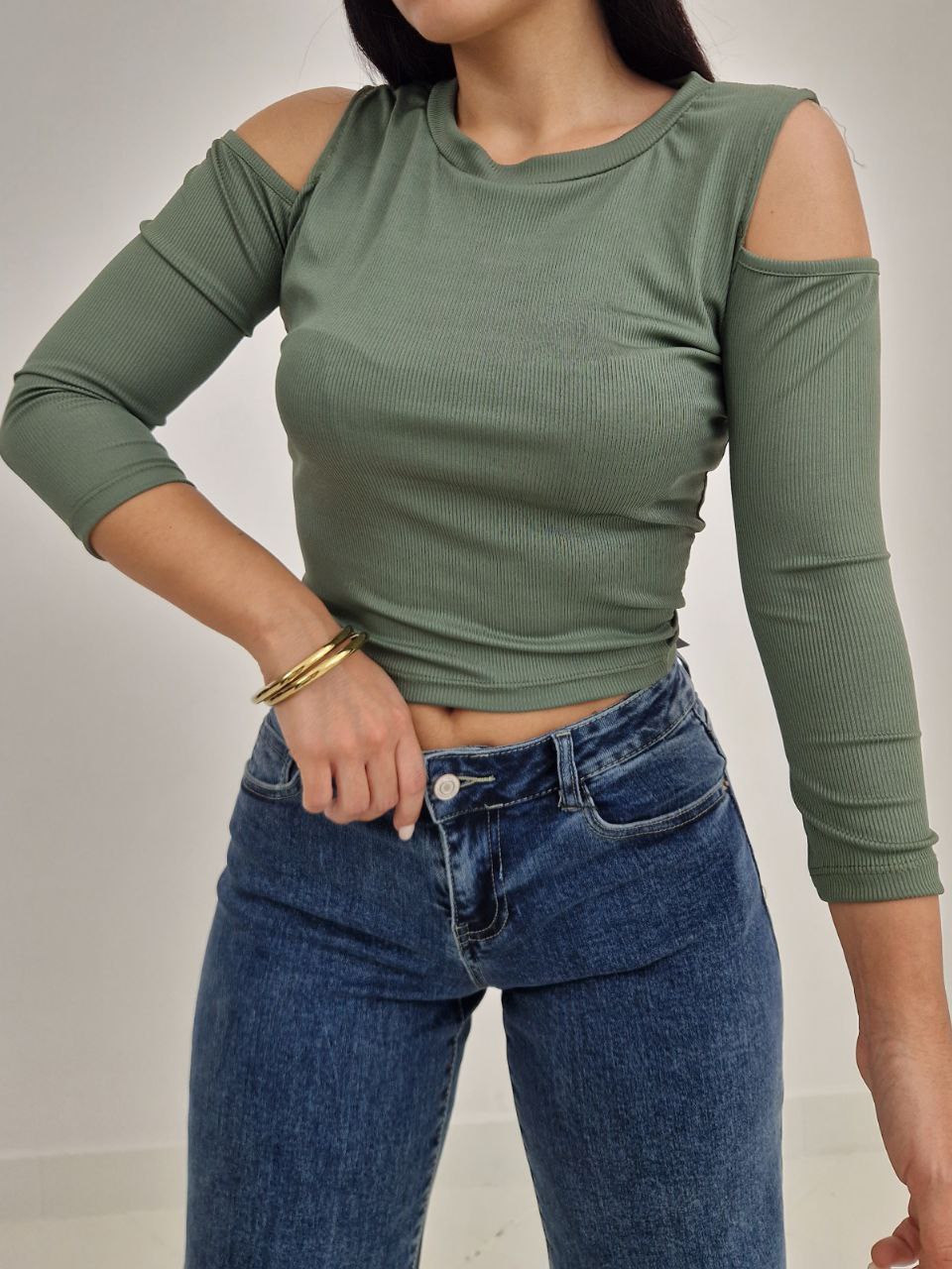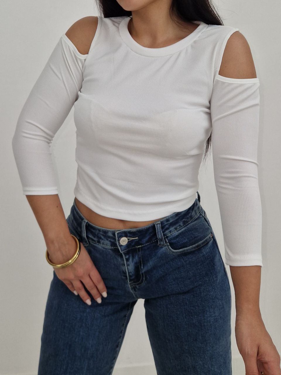 Maglia crop a costine con manica al gomito e spalle scoperte. La taglia è unica vestibilità dalla XS fino a taglia L.