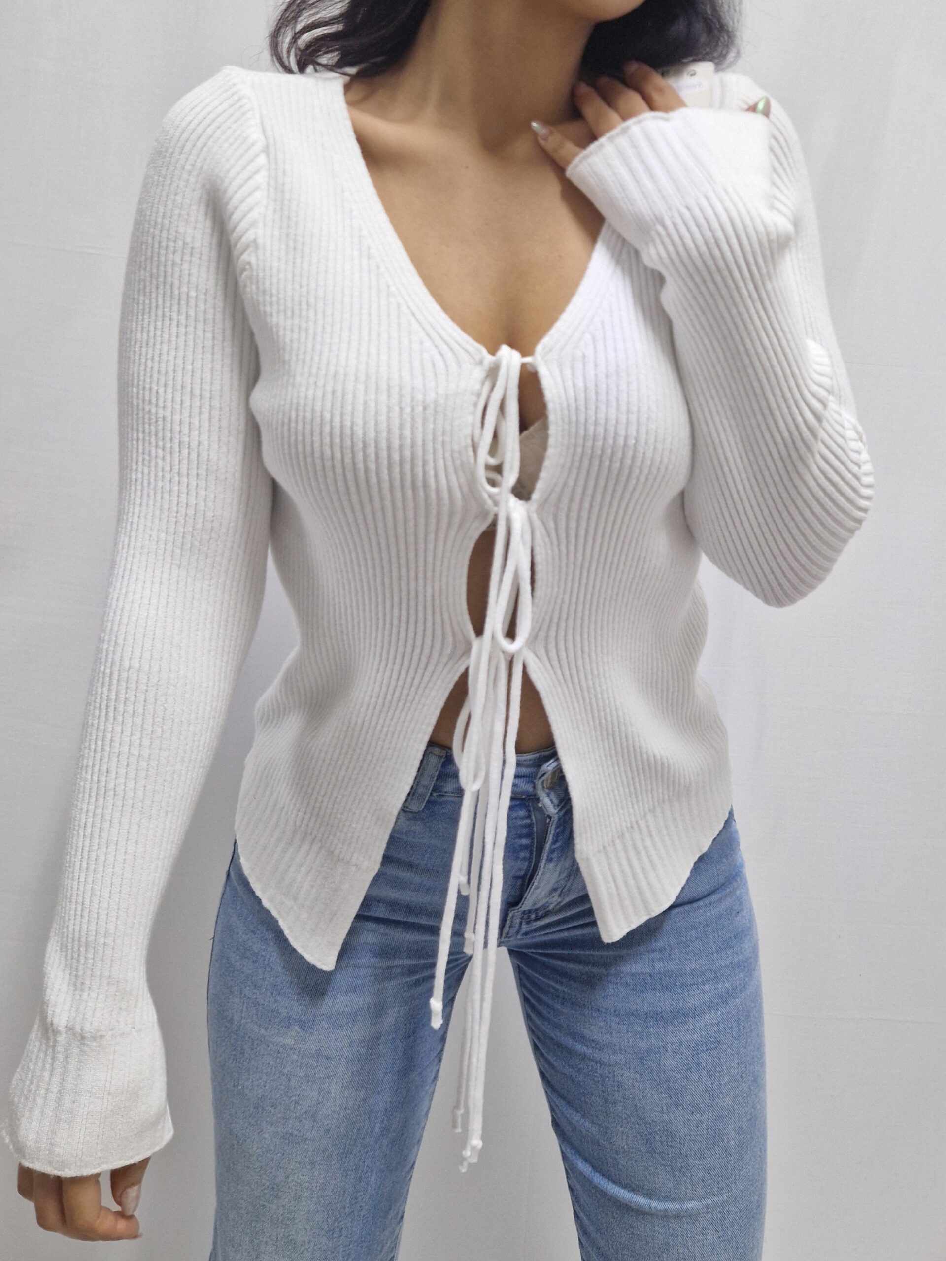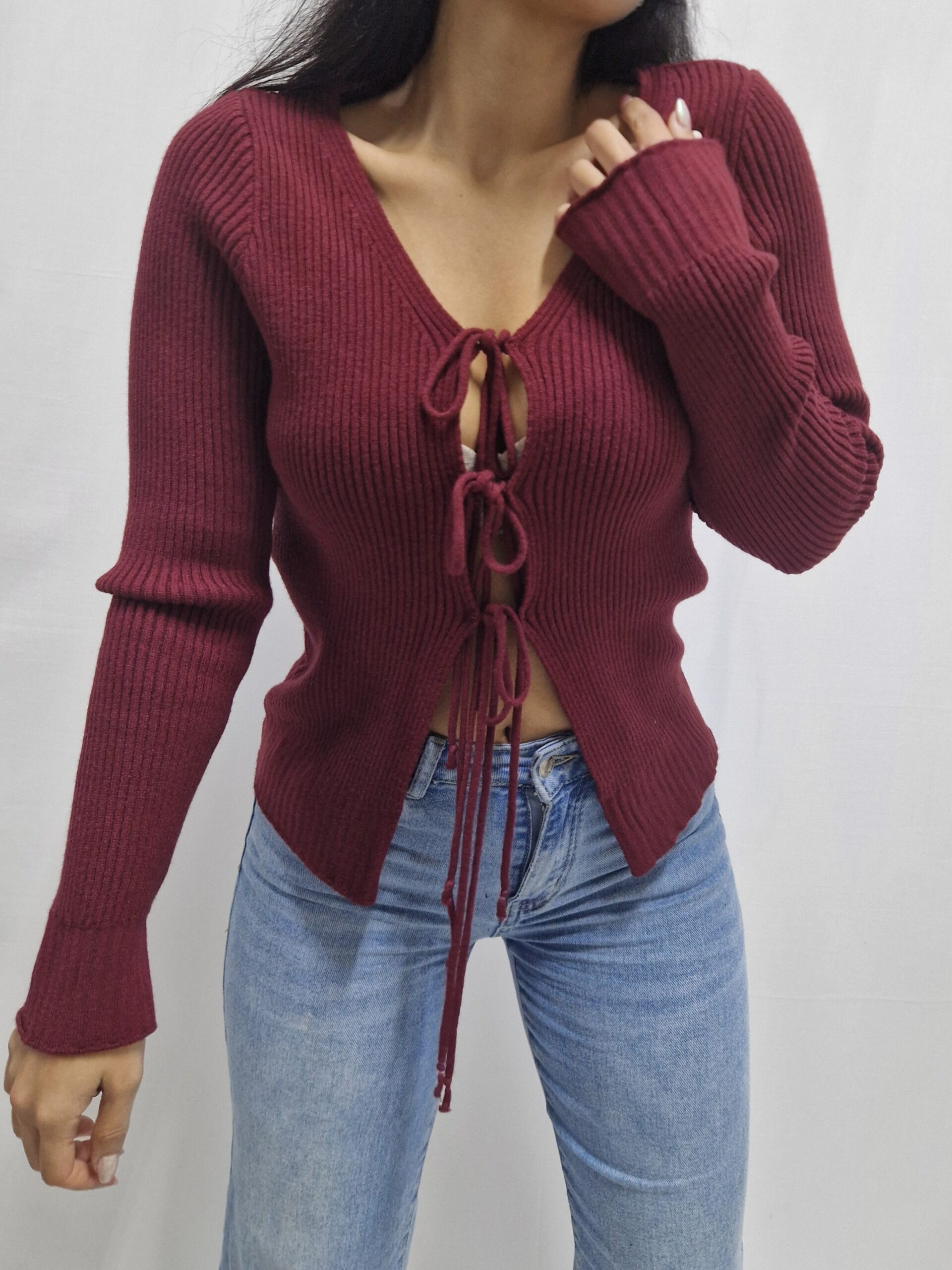Maglioncino o cardigan, con lacci come chiusura. La taglia è unica vestibilità dalla S alla XL.