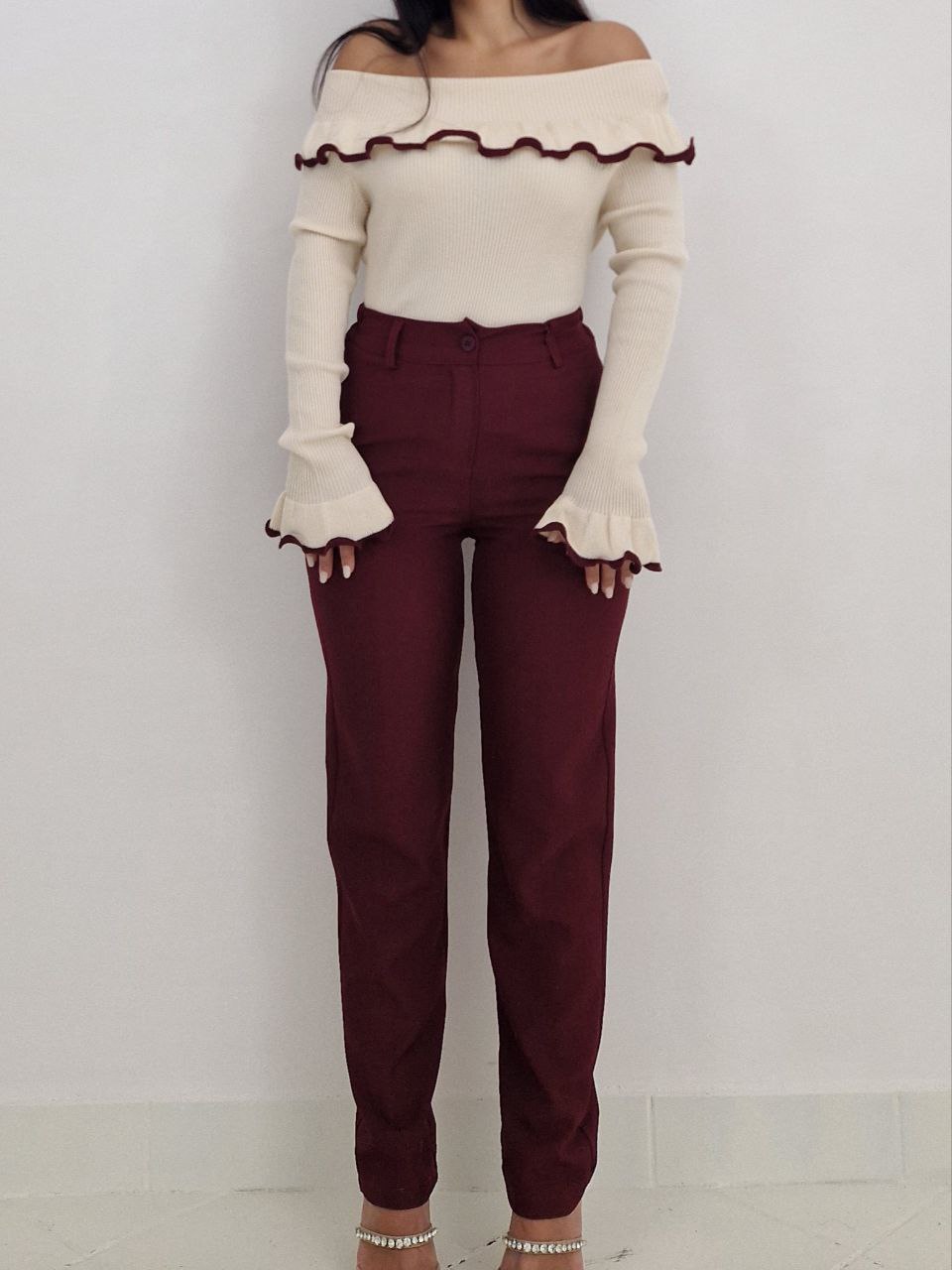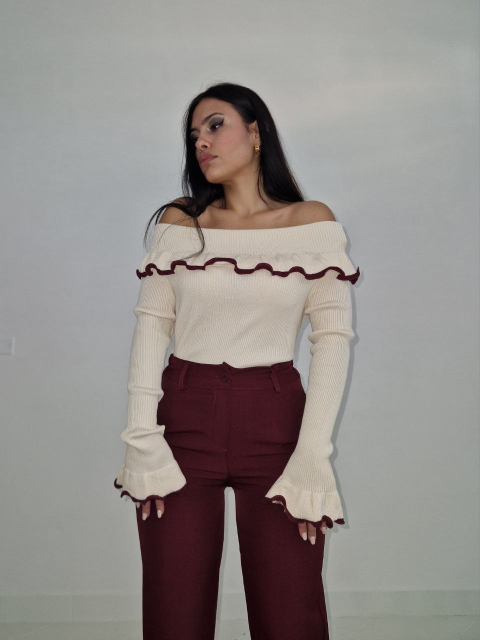 Maglioncino con scollo a barca e rouches sullo scollo e sui polsi con bordi colorati. La taglia è unica, il tessuto è elasticizzato, vestibilità dalla S fino a taglia XXL.