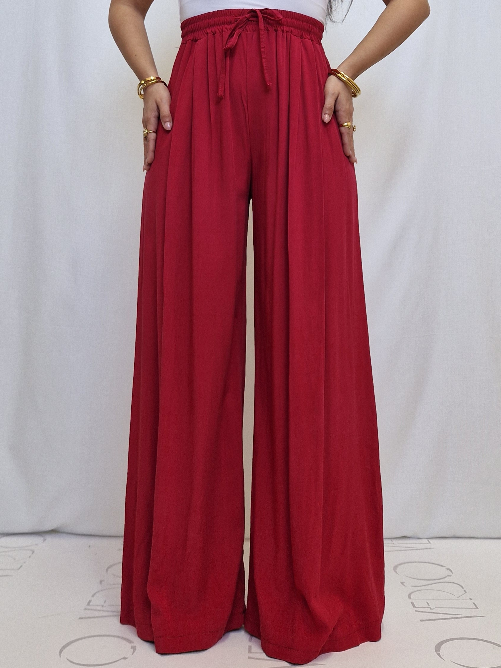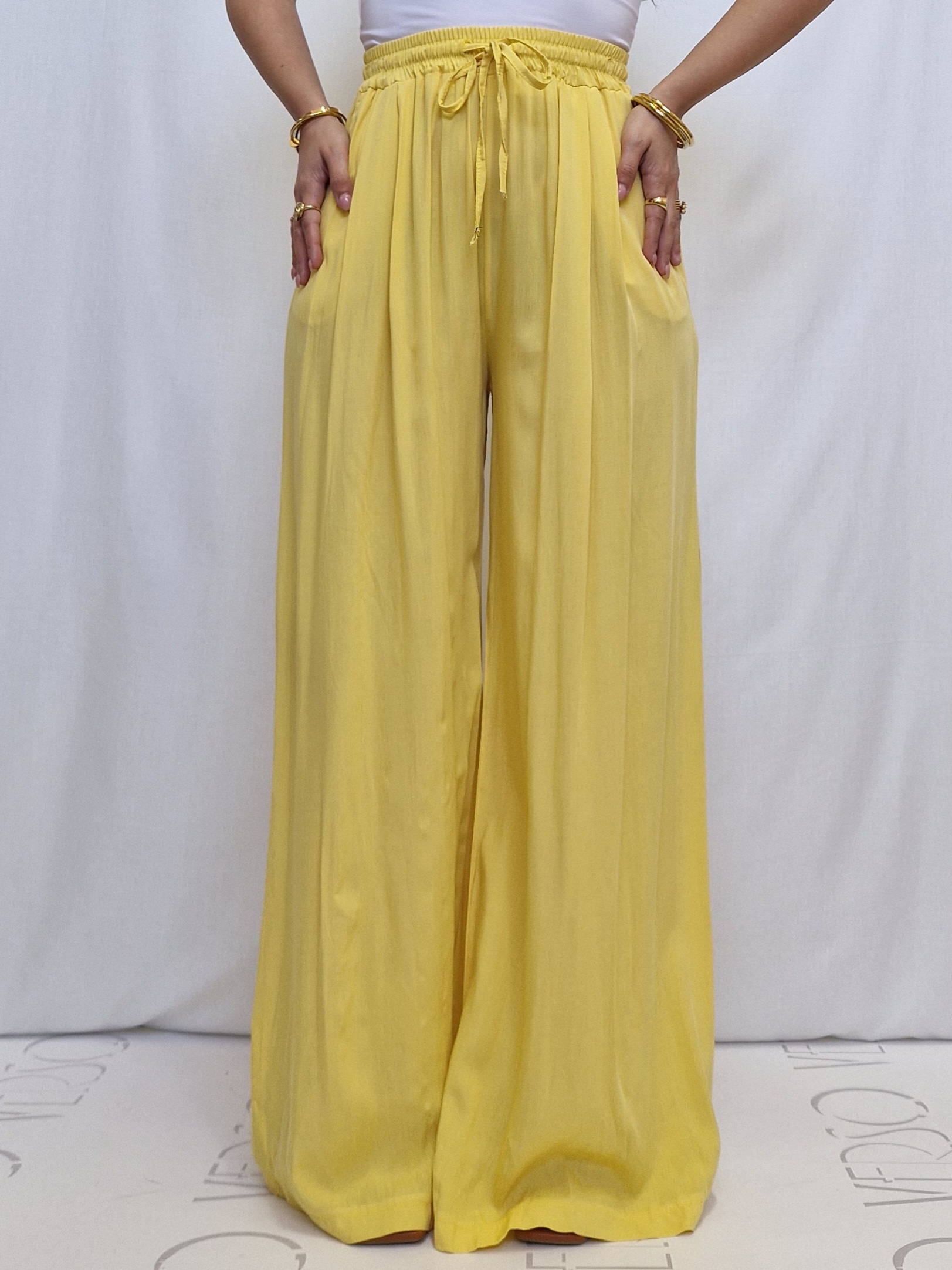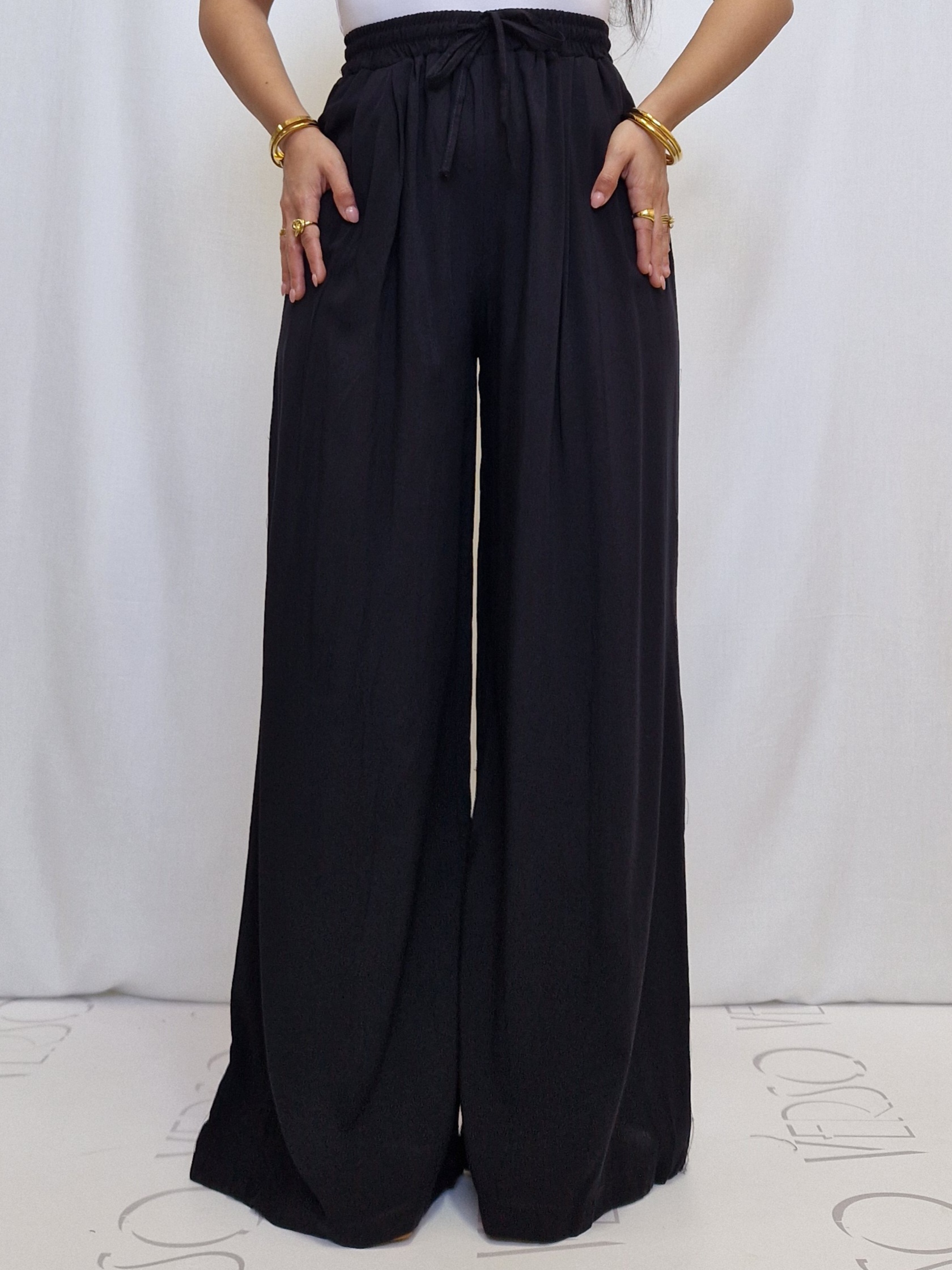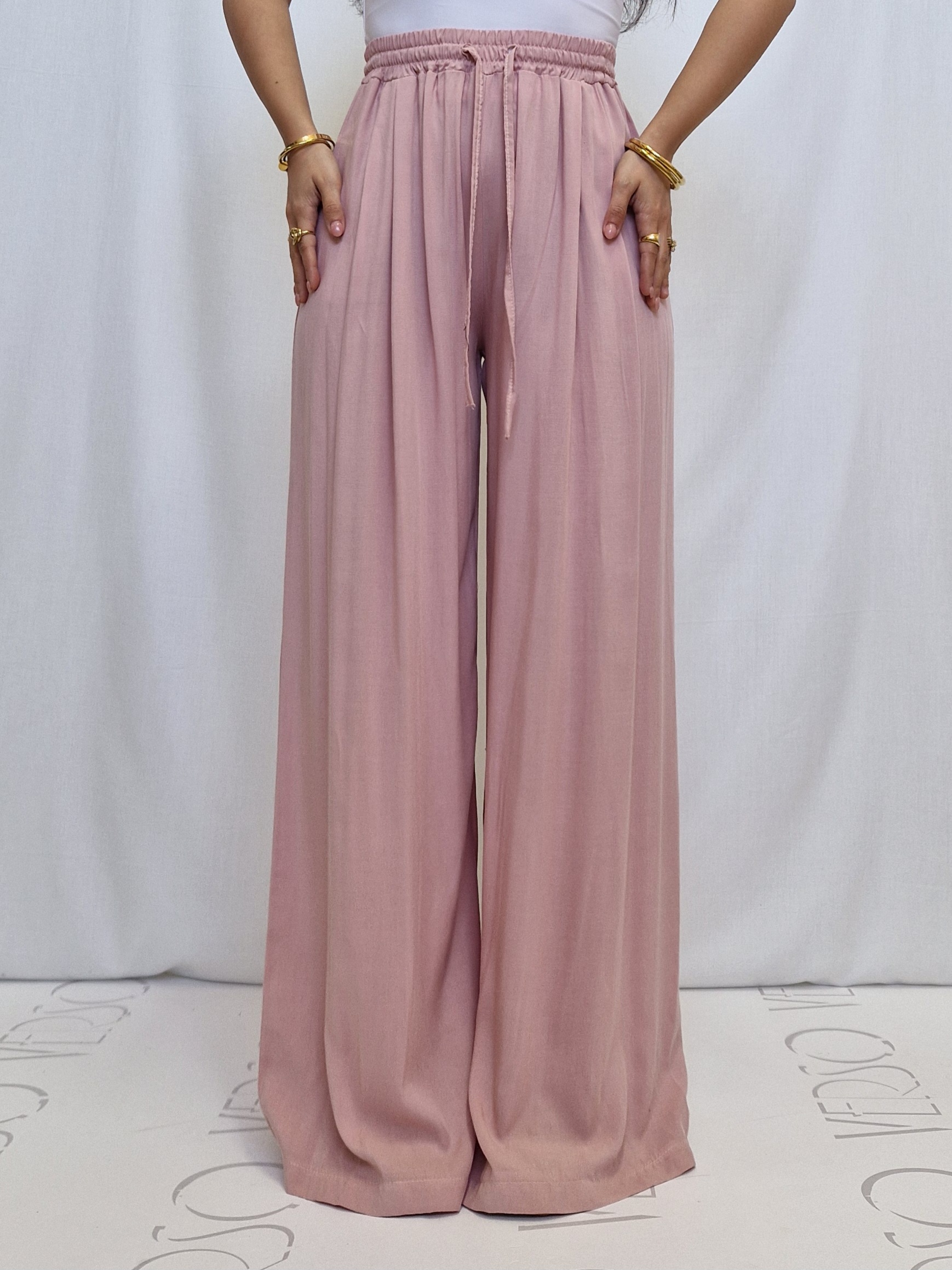 Pantalone a palazzo in fresco cotone, elasticizzato con laccio regolabile.