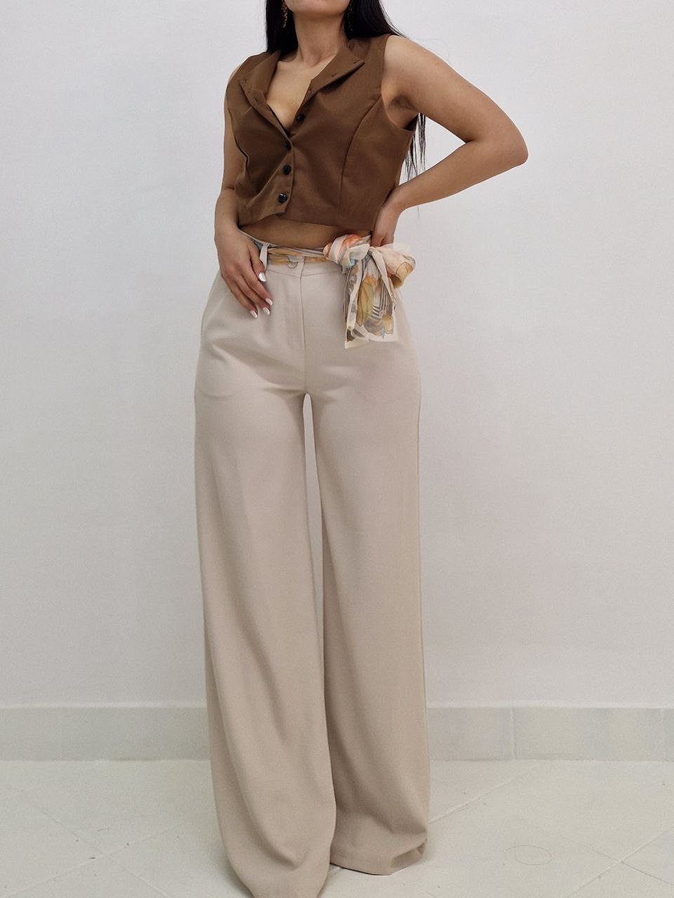 Pantalone palazzo in chiffon, cintura in chiffon con fantasia, elastico sul retro e chiusura con bottone e cerniera. Presenta anche tasche laterali. La taglia è unica vestibilità regolare dalla S fino a taglia L.