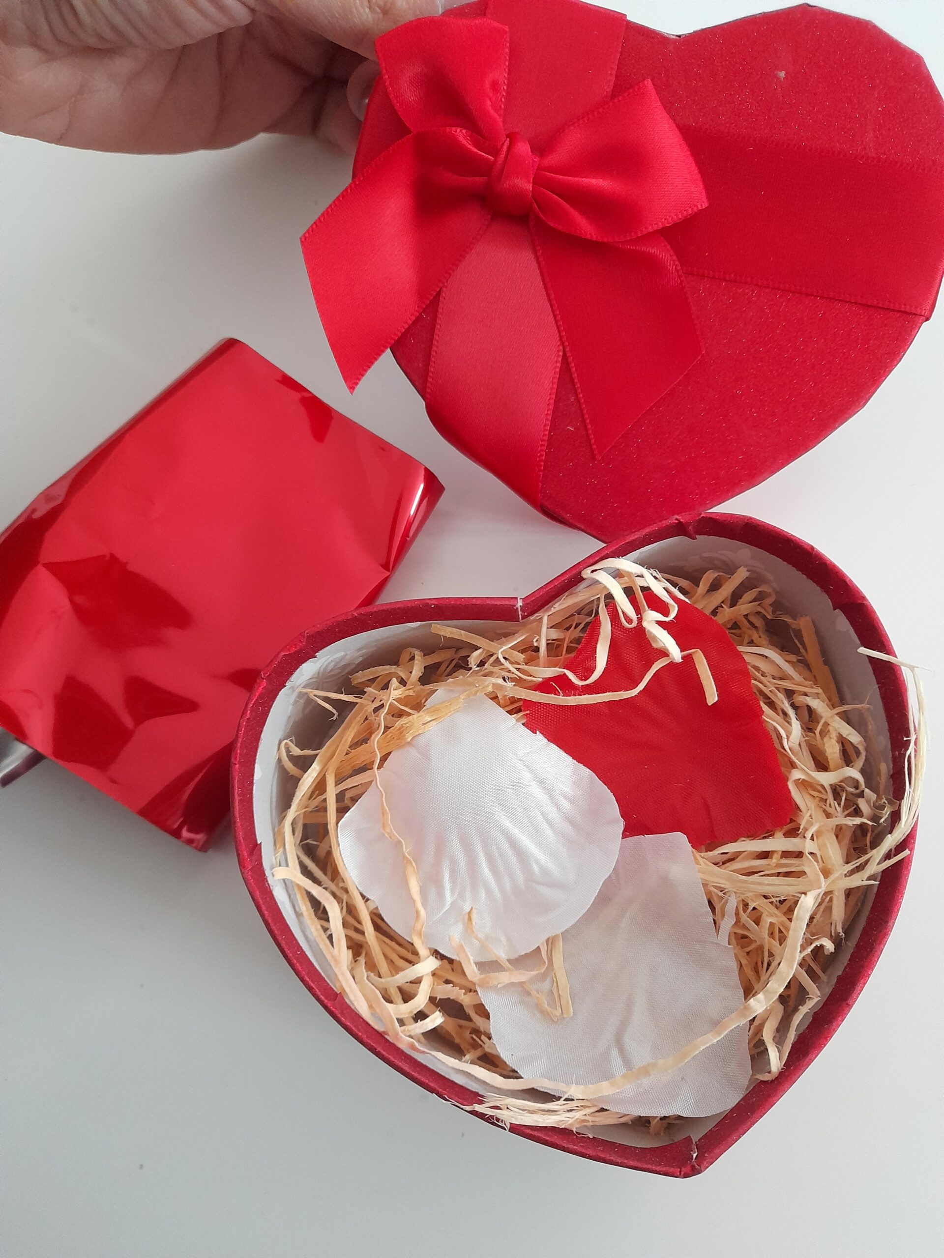 Box San Valentino comprende: scatola a cuore, bustina rossa da inserire all’interno (ideale per bracciali rigidi) e preparazione come in foto