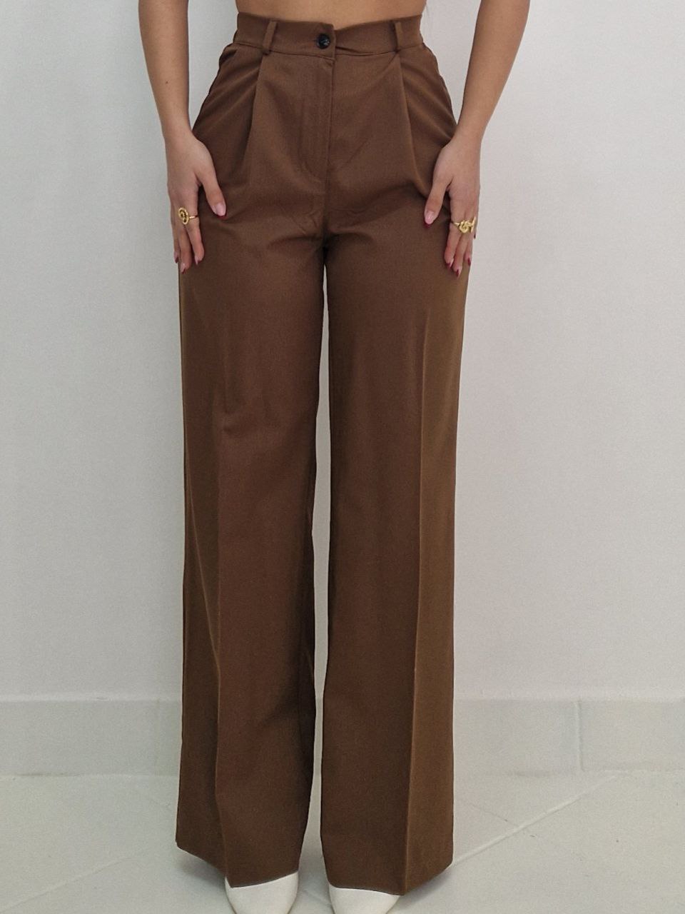 Coordinato tre pezzi, composto da giacca., smanicato (foderato internamente) e pantalone a palazzo con tasche. La taglia è unica vestibilità dalla S fino a taglia L/XL.