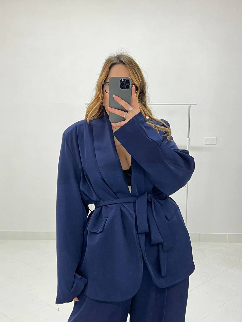 Tailleur curvy composto da giacca a kimono aperta e fusciacca, pantalone a palazzo con elastico in vita e tasche. La taglia è unica vestibilità dalla taglia 48/50 fino a taglia 52/54.