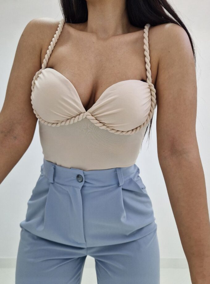 Top brillantinato ad intreccio in vita, bretelle regolabili e zip sul retro. Il tessuto è elasticizzato. La taglia è unica vestibilità dalla S fino a taglia L.