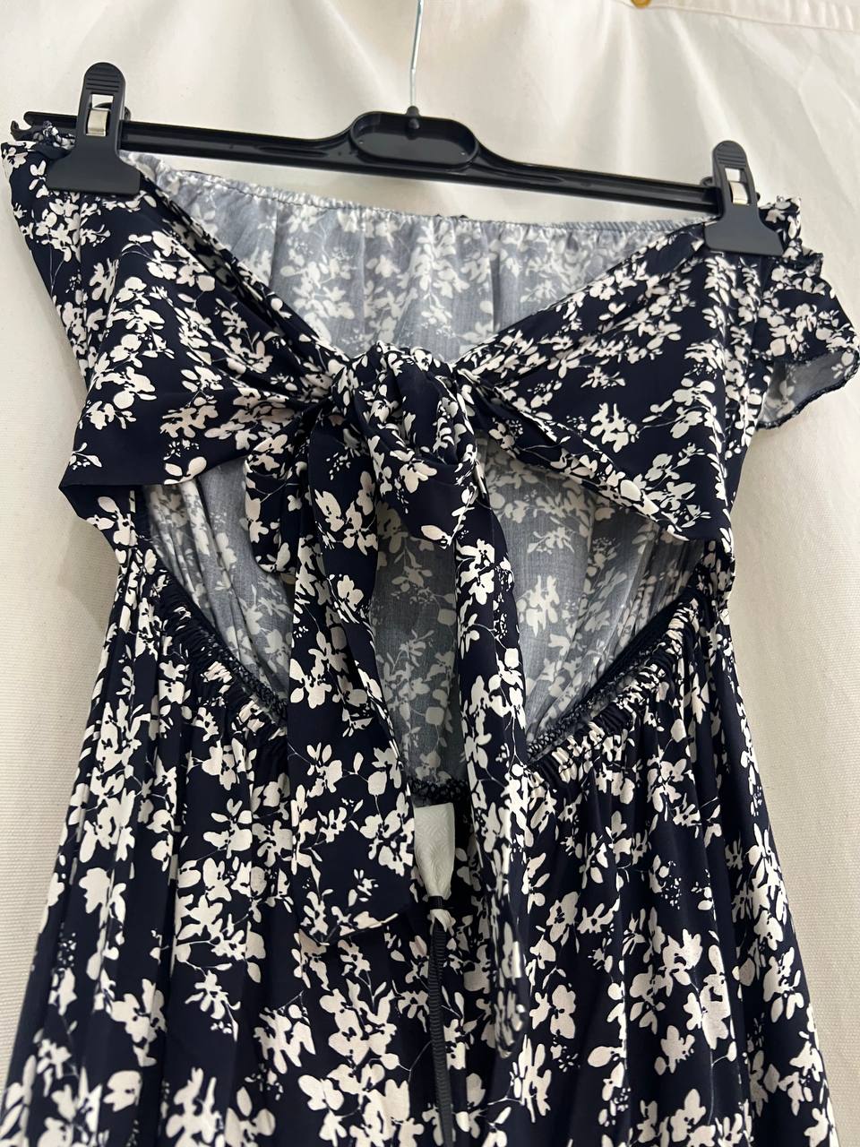 Abito con fiori, elastico sul retro e spacchetto sul lato destro. La taglia è unica vestibilità dalla S fino a taglia XL.