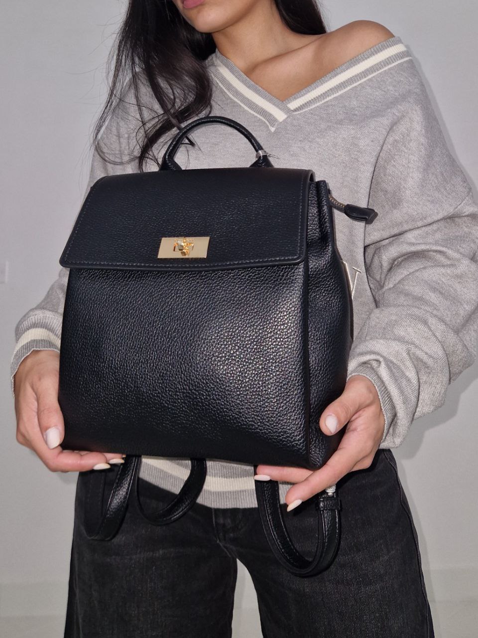 Zaino nero in ecopelle chiusura particolare con doppio scompartimento interno e cerniera centrale.